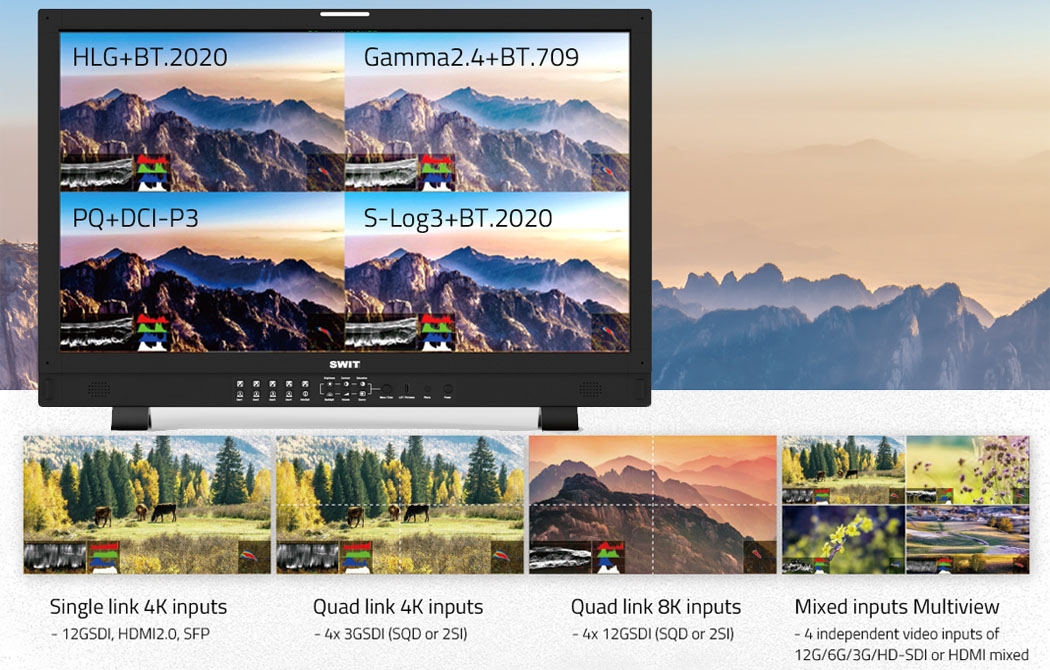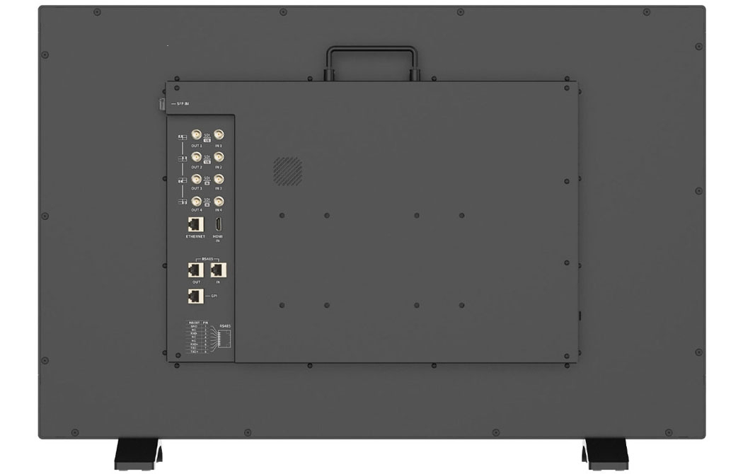Монитор имеет четыре проходных интерфейса 12G/6G/3G/HD/SD-SDI (Single link 4K, Quad link 4K, и Quad link 8K), HDMI спецификации 2.0 (4K60P) и SFP Fiber 12G (оптический SFP адаптер в комплект поставки не входит). Вы можете одновременно выводить 4 независимые видео в формате 4K в (режим multiview) поддерживающий смешанные форматы 12G/6G/3G/HD-SDI и HDMI® 2.0/1.4/1.3, а также выбор формы сигнала, вектора, аудиометров, EOTF и цветовой гаммы для каждого входа.