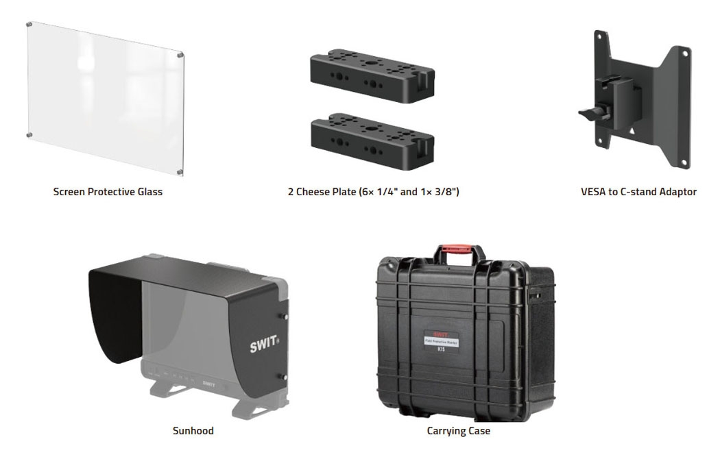 SWIT K15 поставляется с пластиковым транспортным кофром, защитным стеклом, адаптером VESA to C-stand, солнцезащитным козырьком и двумя крепежными пластинами Cheese Plate (6× 1/4" и 1× 3/8").