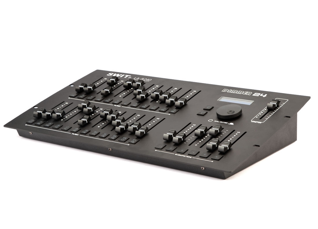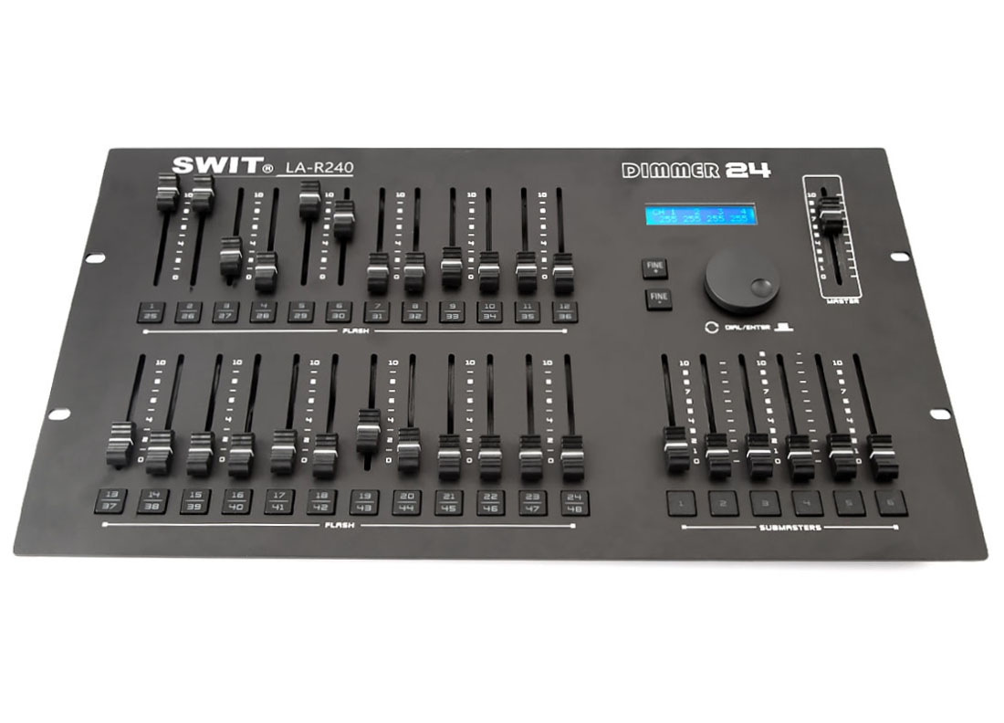 SWIT LA-LA-R240 пульт управления осветительными приборами по протоколу DMX512. Имеет 24 прямых слайдера управления световым потоком и 6 слайдеров шины "Submaster" позволяют объединять любые из 24 каналов в группы.