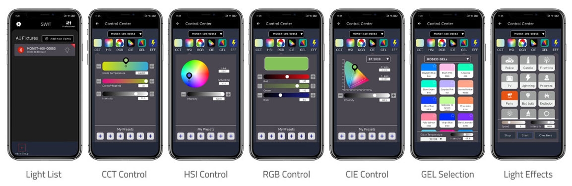 Для управления цветовым потоком и яркостью панели можно использовать локальное управление, DMX512 или мобильное приложение SWIT Console установленное на IOS/Android устройства.