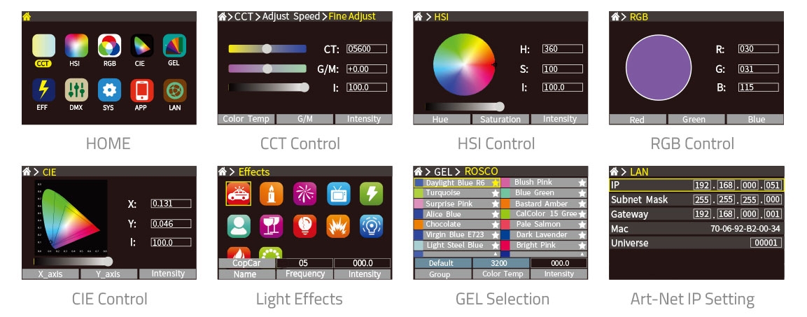 - Цветовая модель: CCT/HSI/RGB/CIE/GEL/EFF