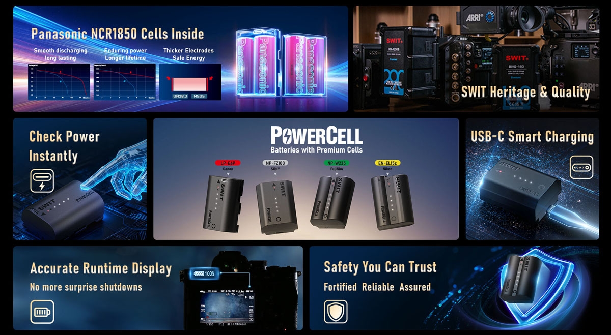 Нанкин, Китай – Компания SWIT Electronics Co., Ltd. представляет серию аккумуляторов PowerCell — линейку аккумуляторов USB-C, специально разработанных для современных беззеркальных и компактных кинокамер. В линейку входят PowerCell NP-FZ100 (для SONY), PowerCell LP-E6P™ (для CANON), PowerCell EN-EL15c™ (для NIKON) и PowerCell NP-W235 (для FUJIFILM), обеспечивающие надежное питание, точную индикацию времени работы и длительный срок службы для профессионального использования.