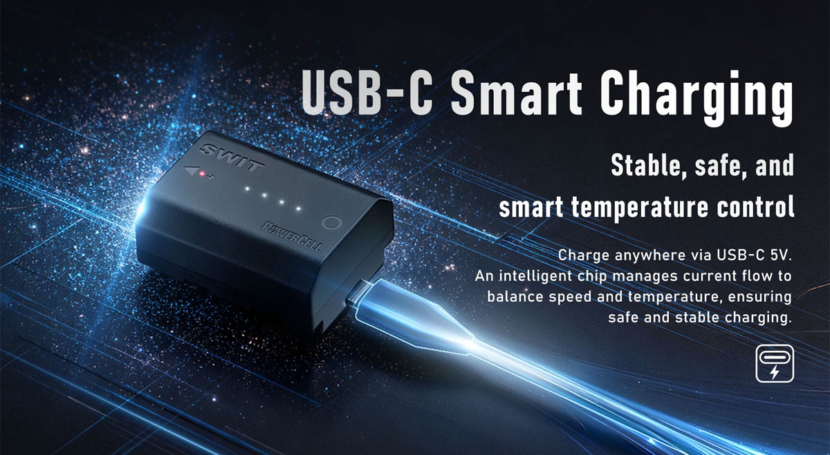 Заряжайте аккумуляторы через USB-C 5В от сетевых зарядных устройств, внешних аккумуляторов или аккумуляторов SWIT серии V-mount с выходом USB-C — оригинальное зарядное устройство не требуется. Встроенная интеллектуальная схема управления обеспечивает стабильный заряд, предотвращает перегрев и продлевает срок службы аккумулятора. Идеально подходит для путешествий, удалённых работ и команд быстрого реагирования.