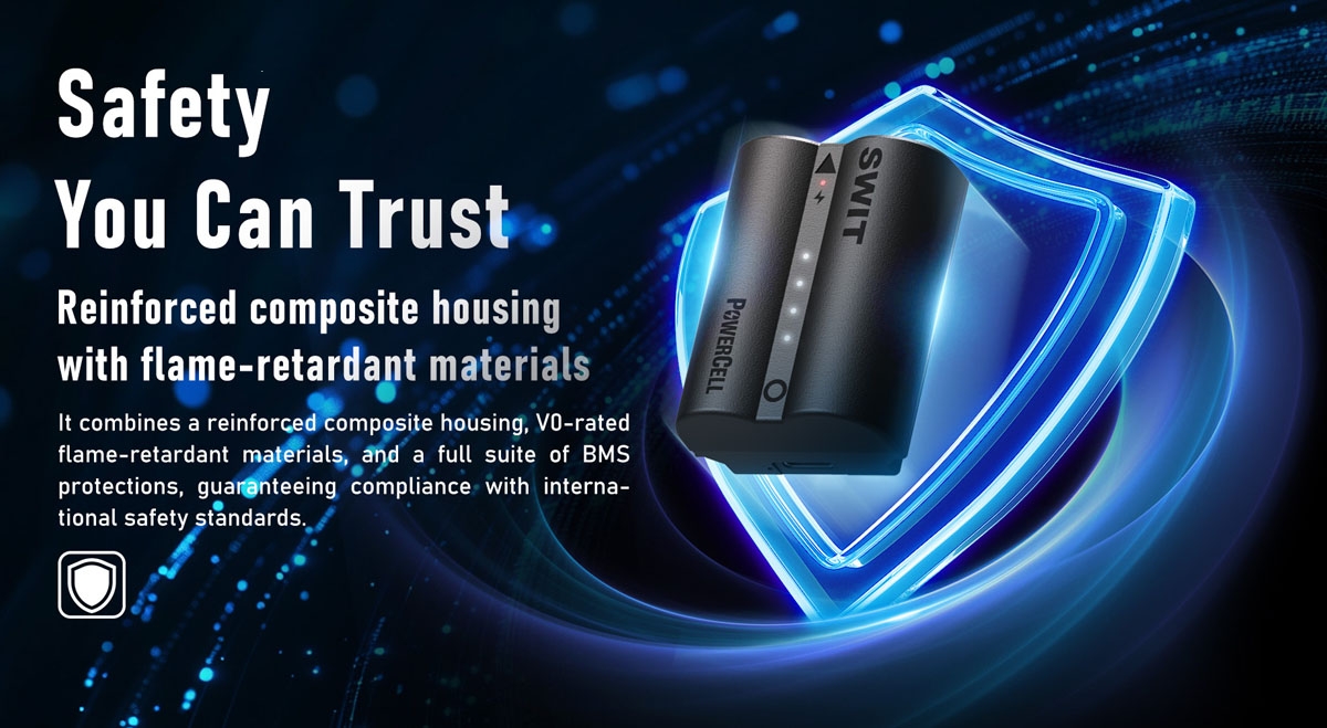 Кроме премиальных элементов питания Panasonic, аккумуляторы PowerCell оснащены усиленным композитным корпусом и огнестойкими материалами, обеспечивающими дополнительную защиту от ударов, нагрева и сложных условий на съёмочной площадке. Такая конструкция гарантирует безопасность профессионального уровня, сохраняя при этом лёгкость и портативность.