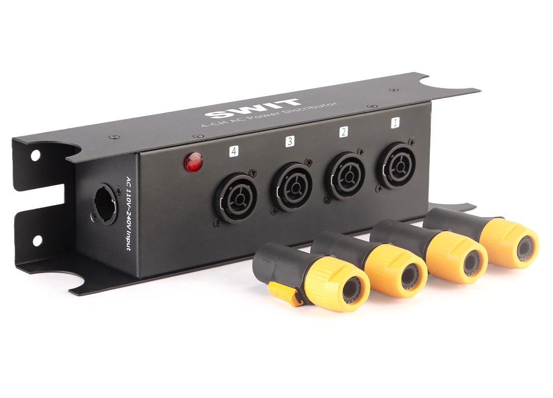 SWIT PA-J416 распределитель питания 1х4 с разъемами PowerCON и максимальной нагрузкой 3500Вт. Решает проблему прокладки большого количества кабелей в подвесных системах распределителя электроэнергии для освещения. Может использоваться как вспомогательный разветвитель основного кабеля питания при прокладке осветительных каналов в студийных павильонах, виртуальных студиях, панорамных студиях и фотостудиях.