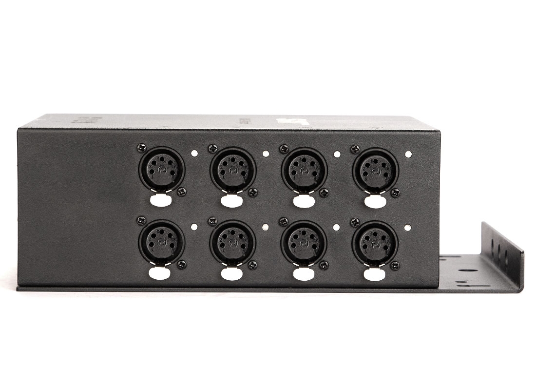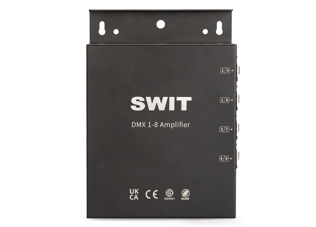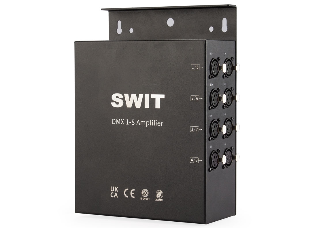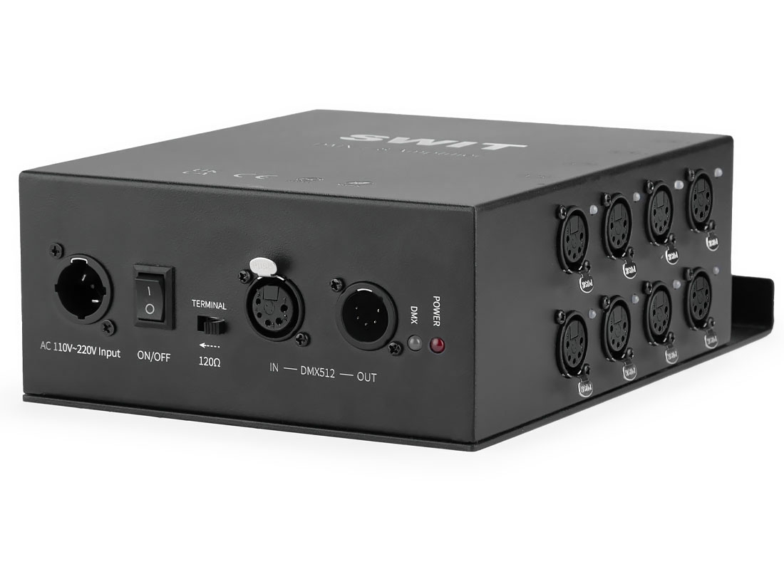 SWIT SA-D38 распределитель сигнала DMX512 с изолированными выходами. Позволяет организовать восемь линий управления осветительными приборами в студиях, конференц-залах или государственных учреждениях.