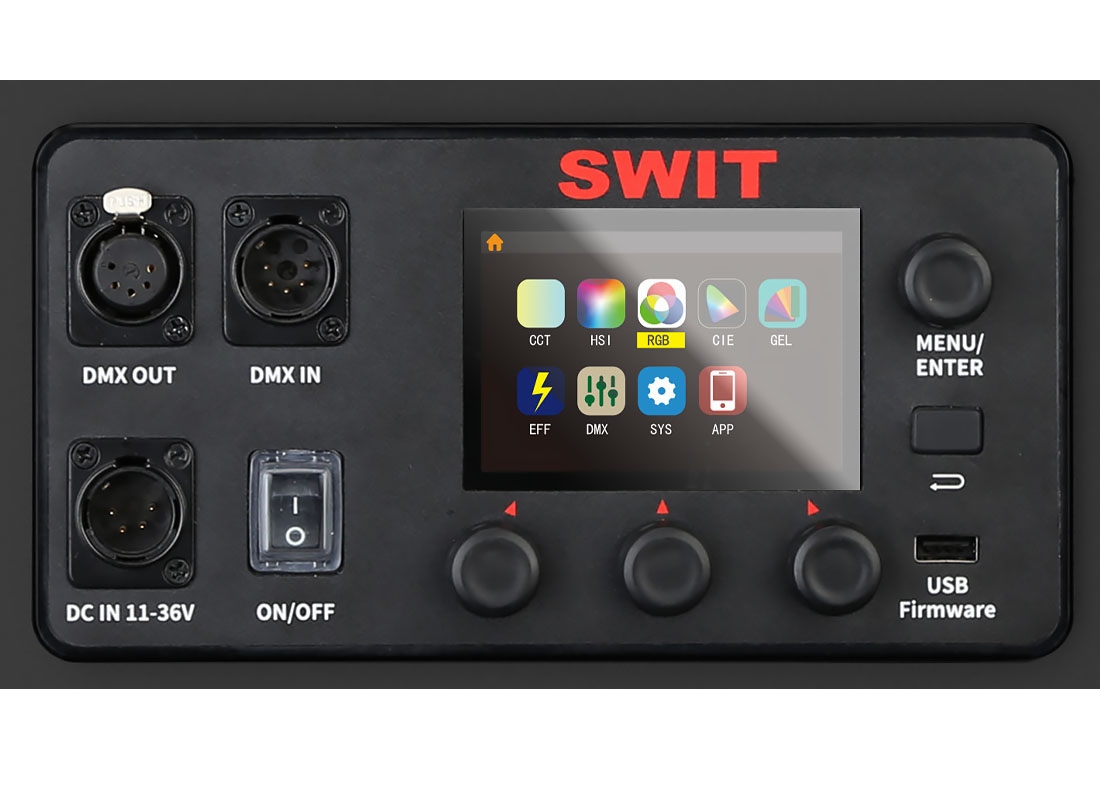 Для управления цветовым потоком и яркостью панели можно использовать локальное управление, DMX512 или мобильное приложение SWIT Console установленное на IOS/Android устройства.